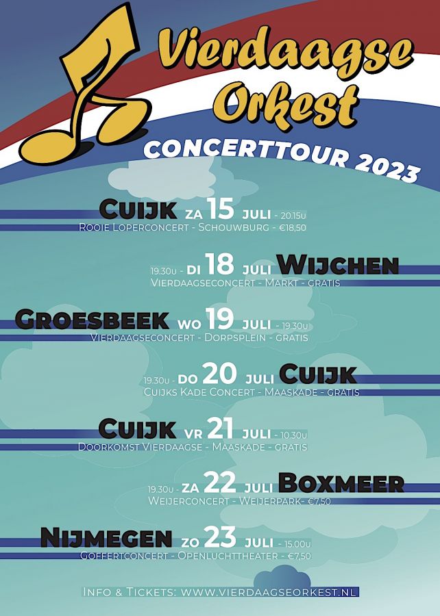 Het Vierdaagse Orkest treedt in totaal zeven keer op. Na de première in de schouwburg van Cuijk op zaterdag 15 juli volgt het concert op de gezellige Markt in Wijchen op dinsdagavond 18 juli. In Groesbeek speelt het Vierdaagse Orkest op het Dorpsplein op woensdagavond 19 juli. Een dag later is het concert op de Maaskade in Cuijk.