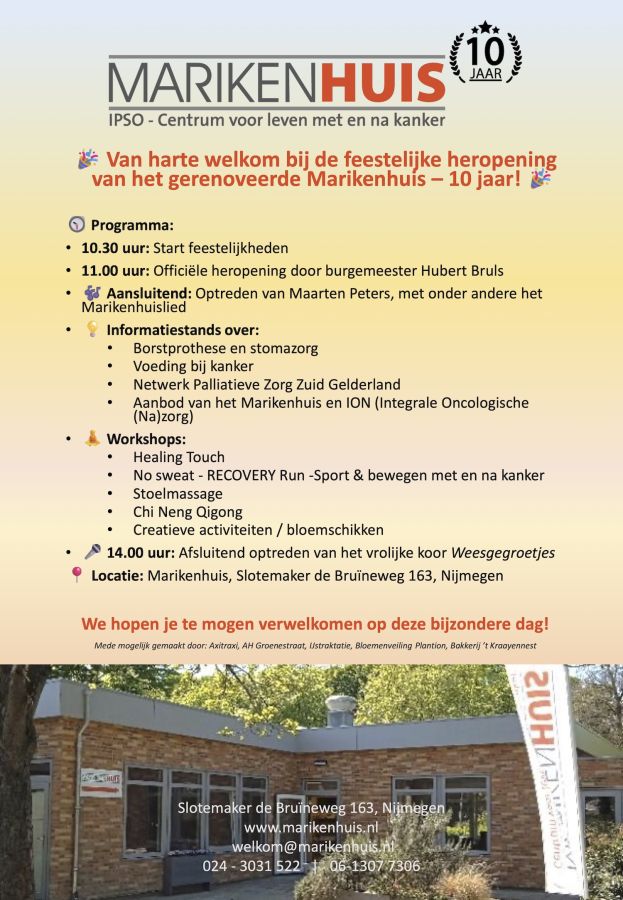 Het Marikenhuis, het centrum voor mensen met en na kanker, bestaat tien jaar. Dat vieren we dit hele jaar met extra activiteiten. Zondag 25 mei is de feestelijke heropening van het fraai gerenoveerde pand. Iedereen is welkom.