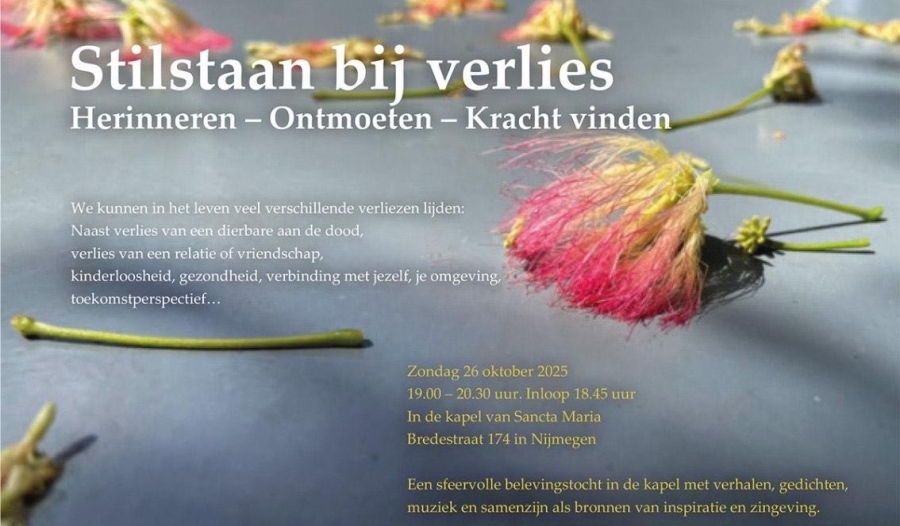 Deze avond is bedoeld voor iedereen die verlies kent en daar aandacht aan wil geven. Soms komt dit verlies plotseling, of ontstaat het geleidelijk, soms is het een gevolg van gemaakte keuzes. Het leven is niet meer zoals het was, je “normale” doen is verstoord… Misschien vraagt dit actie, of juist stilstaan bij de ervaring die het verlies oproept.