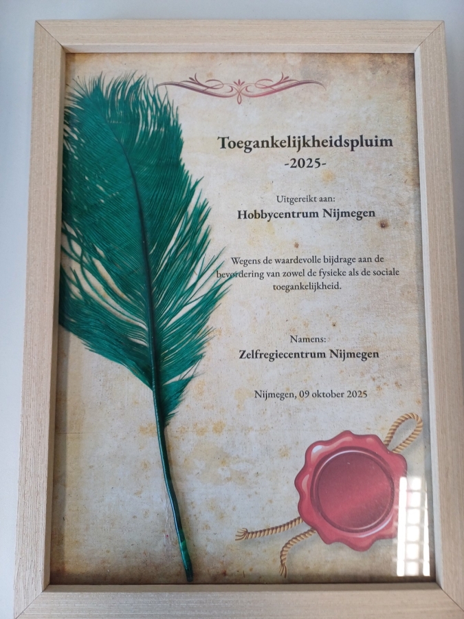 Hobbycentrum Nijmegen (HcN) heeft op 9 oktober de Toegankelijkheidspluim 2025 gekregen. Deze wordt jaarlijks uitgereikt aan organisaties die zich inspannen voor een goede toegankelijkheid van hun pand. De prijs is uitgereikt door Wiljan Borremans van het Zelfregiecentrum Nijmegen.