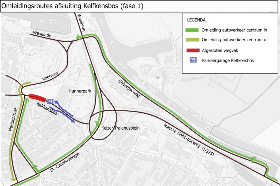 Woningen, (horeca)bedrijven en organisaties blijven bereikbaar. Fietsers kunnen voorlopig nog langs het Kelfkensbos. Auto’s en bussen rijden via omleidingsroutes. De omleidingen staan ter plekke aangegeven met borden, zie onderstaande afbeelding voor de afsluiting.