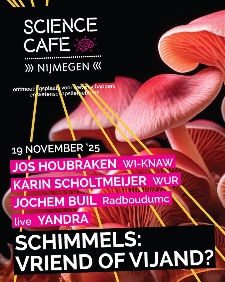 Wat is het grootste organisme op aarde? Misschien denk je aan een walvis of een boom, maar het is een schimmel! Schimmels leven in onze bodem, in ons voedsel en zelfs in ons lichaam. Ze zijn overal en spelen een stille, maar essentiële rol in het leven op aarde. Maar zijn ze onze verborgen bondgenoot of onzichtbare vijand? En verschuift deze balans? Op 19 november duikt Science Café Nijmegen in de mysterieuze wereld van schimmels. Van de paddenstoelen die na een regenbui uit de grond schieten tot microscopisch kleine soorten die gedijen in de schaduw, schimmels weten ons evenzeer te intrigeren als te verontrusten.