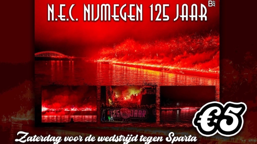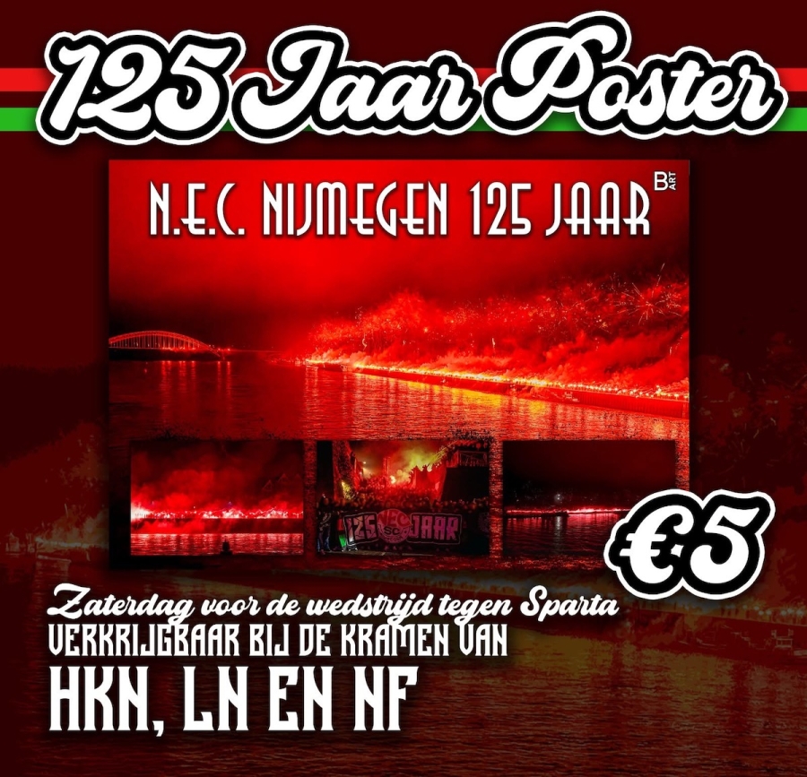 East Side & HKN, Legio Noviomagum en Nijmegen Fanatics hebben samen met de bekende 55-jarige stadsfotograaf Bart Kouwenberg deze prachtige poster gemaakt voor 125 jaar NEC. Bart: “Ik vind het fantastisch om samen met de verschillende supportersgroepen van onze club zo’n eenheid uit te stralen. En dat was ook exact wat er die nacht gebeurde!”