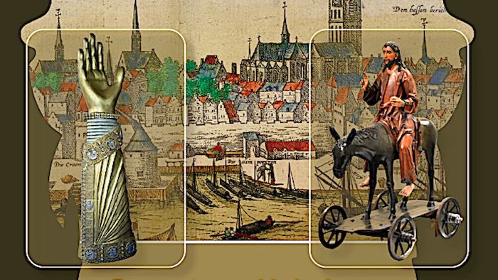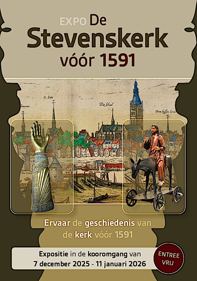 Ervaar de geschiedenis van de kerk vóór 1591. De kerk was gevuld met vele altaren en tegen alle pilaren stond een heilige. Aan de hand van digitale platen en films kunt u de eerste drie eeuwen van de Stevenskerk ontdekken. Bewonder het Nijmeegs Schippers Antependium,. Allerlei beelden, objecten, liturgisch vaatwerk, boeken en vaandels zijn te zien. Een gotisch ingerichte triptiek kapel. Een gotische kerststal van Nijmeegse jongens. Veel korte films met koptelefoon te beluisteren.