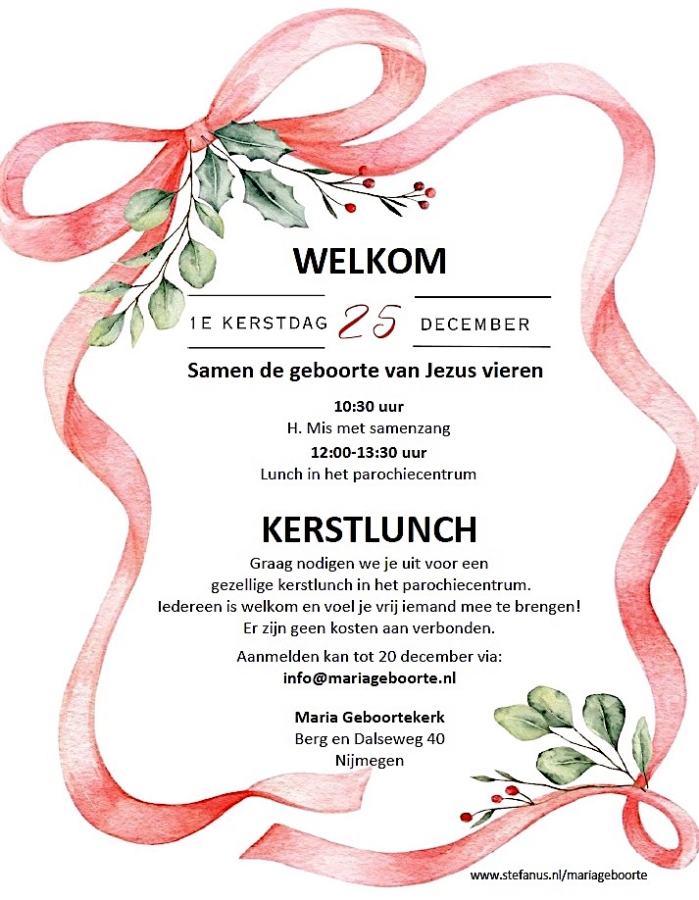 Behoefte aan gezelschap op Eerste Kerstdag 25 december? Schuif aan bij de gratis Kerstlunch van 12.00 - 13.30u in de Maria Geboortekerk aan de Berg en Dalseweg 40 in Nijmegen-Oost (voorafgaand Heilige Mis om 10.30 uur).