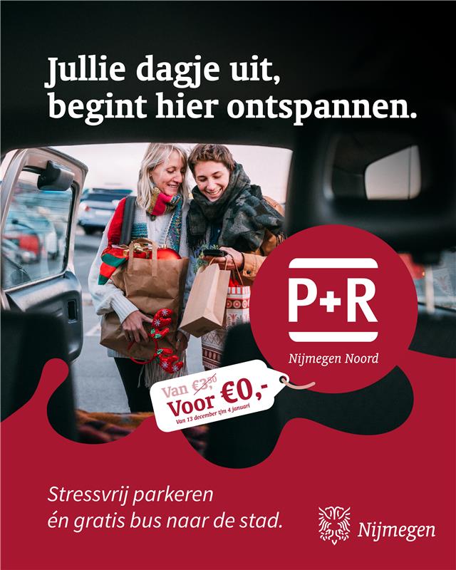 Tijdens de Winterweken van 13 december tot en met 4 januari parkeren bezoekers gratis op de P+R Nijmegen Noord. In deze weken is er een feestelijk programma in de Nijmeegse binnenstad met allerlei activiteiten. Met hun parkeerticket reizen ze gratis naar hun bestemming. Het parkeerticket geldt als buskaartje voor 4 personen of kan gebruikt worden om 1 elektrische fiets te huren op de P+R (€7,- per extra fiets). Zo kunnen bezoekers op een laagdrempelige manier de P+R uitproberen.