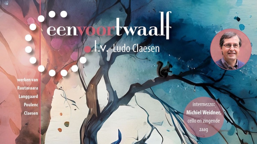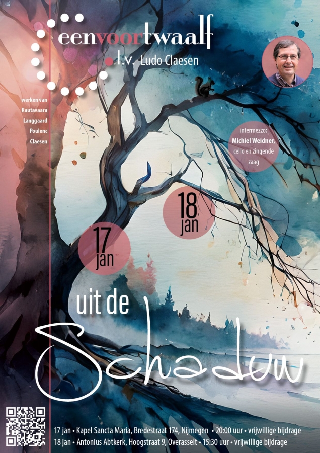 Iedereen is van harte welkom in het nieuwe jaar, op 17* en 18 januari bij de concerten van Een voor Twaalf. Onder de titel “Uit de schaduw" brengen ze een sfeervol, contrastrijk programma met verrassende elementen. Vier eigentijdse componisten passeren de revue: Ludo Claesen, Rued Langgaard, Francis Poulenc en Einojuhani Rautavaara.