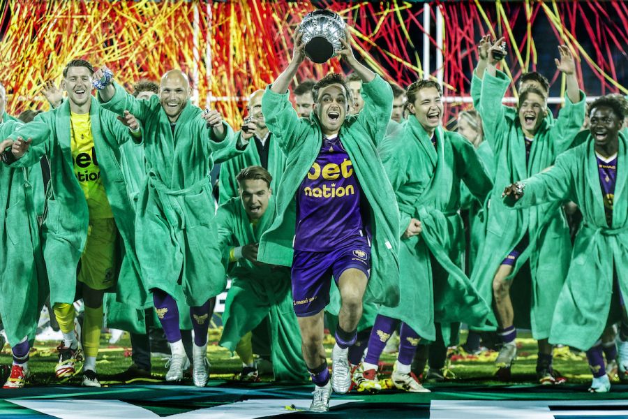 Go Ahead Eagles pakt de KNVB Beker in de Kuip, Rotterdam op 21 april 2025. Aanvoerder Mats Deijl toont de beker aan de supporters uit Deventer.