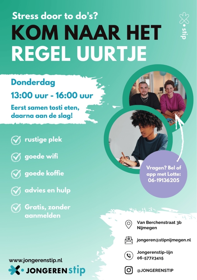 Je kunt elke donderdag van 13:00 tot 16:00 uur terecht bij de Jongerenstip, aan de Van Berchenstraat 3B in Nijmegen. Heb je nog vragen? Neem dan contact op met Lotte Zekhuis via 06 19 136 205.