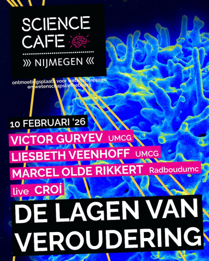 Het Science Café van 10 februari brengt drie onderzoekers samen die elk veroudering op een andere schaal bestuderen. Je ziet hoe schade op celniveau veranderingen in het hele systeem in gang zet, waarom verschillende organen in een verschillend tempo verouderen en wat wetenschappers bedoelen met de ‘hallmarks of aging’ – de specifieke biologische haperingen die het verouderingsproces kenmerken. Moleculair bioloog Liesbeth Veenhoff (ERIBA, UMCG) onderzoekt hoe de beschermingsmechanismen rond onze cellulaire bouwstenen in de loop van de tijd kunnen afbreken. Victor Guryev (ERIBA, UMCG), werkzaam op het snijvlak van bio-informatica en systeembiologie, brengt in kaart welke leeftijdsgerelateerde veranderingen in ons DNA daadwerkelijk ziekte veroorzaken. Tot slot neemt geriater Marcel Olde Rikkert (Radboudumc) ons mee naar het niveau van het hele organisme, waar veroudering zichtbaar wordt als een dynamisch, veelzijdig proces met verstrekkende gevolgen voor de geneeskunde en de samenleving.