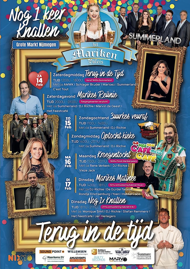 Na 20 jaar gaan ze ermee stoppen, dus van 14 t/m 17 februari kun je nog één keer knallen in de gezelligste feesttent van Knotsenburg! Kom naar het Marikenpaleis met als thema “terug in de tijd” om Carnaval te vieren in het hert van Knotsenburg.