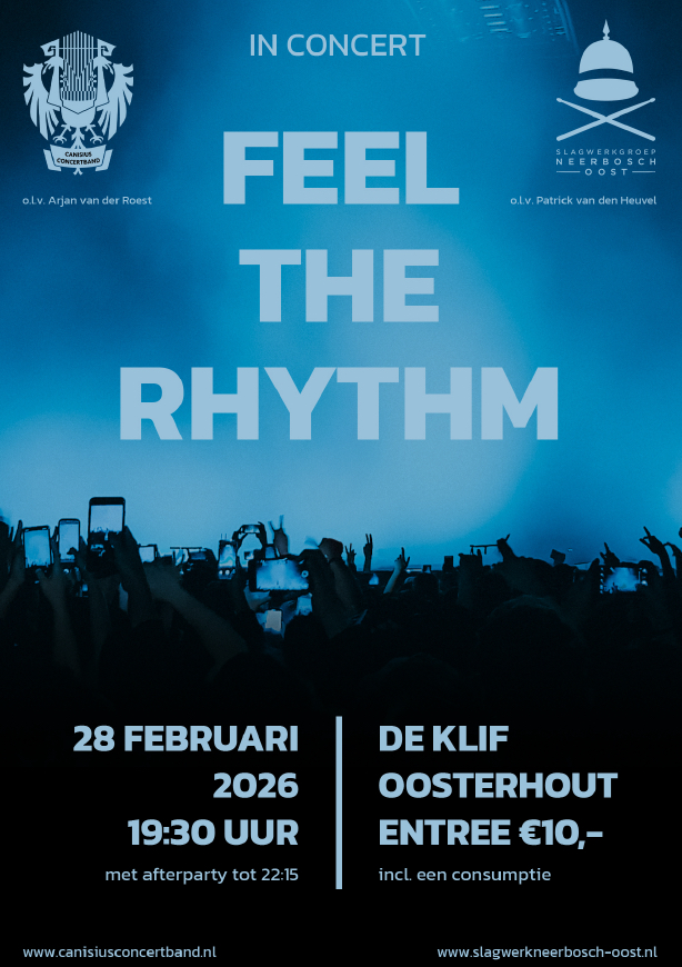 De oudste harmonie in Nijmegen geeft op 28 februari 2026 een concert in wijkcentrum De Klif in Oosterhout (Nijmegen), Zij doen dit in samenwerking met de Slagwerkgroep Neerbosch-Oost. We starten om 19.30 uur. Het wordt een gevarieerd programma met mooie werken voor harmonie en een daverend slagwerkoptreden. Na afloop is het mogelijk om nog even na te borrelen. De entree bedraagt €10,00, inclusief één consumptie. Kaarten reserveren kan via info@canisiusconcertband.nl.
