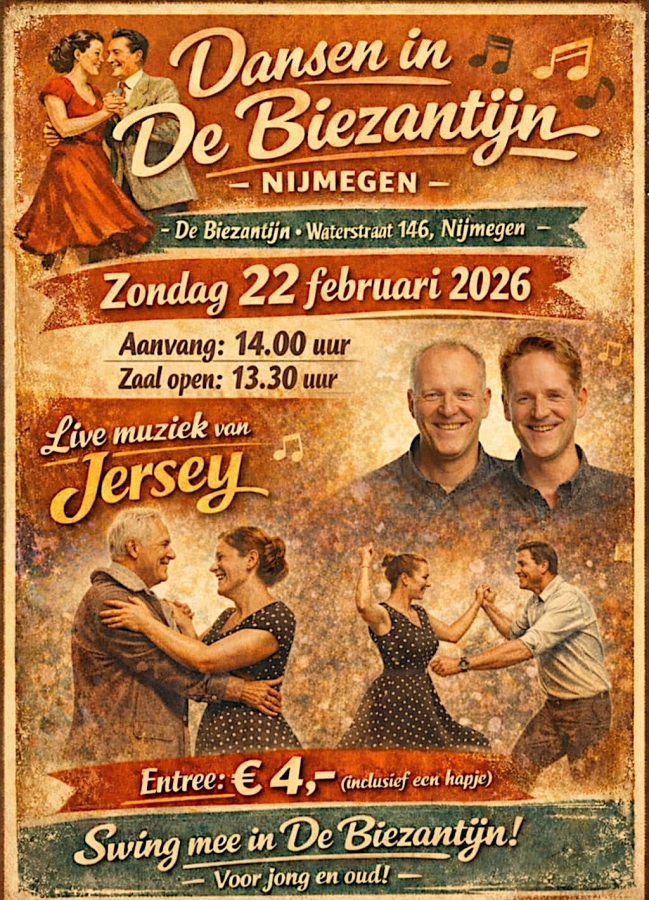 Zondag 22 februari 2026 gaan de voetjes weer van de vloer in Wijkcentrum de Biezantijn aan de Waterstraat 146 in Nijmegen