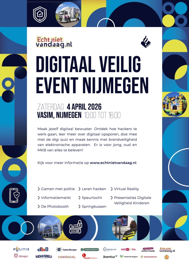 Ontdek hoe hackers te werk gaan, leer meer over digitaal opsporen, doe mee met de digi quiz en maak kennis met brandveiligheid van elektronische apparaten. Er is voor jong, oud en MKB van alles te beleven! Kijk voor meer informatie op www.echtnietvandaag.nl/oost-nederland/activiteiten/nijmegen-veilig-online
