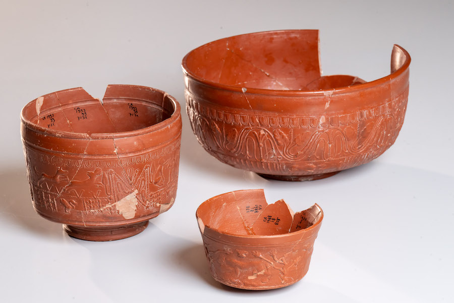Bijvoorbeeld bekers en schalen van een oranjerood servies. Ilse Schuuring, archeoloog van provincie Gelderland: “Het is een luxe aardewerkservies. Je ziet dat aan de techniek waarbij Romeinen met een mal patronen in het aardewerk drukten. Op het servies zie je bijvoorbeeld herten die door een bos springen. Je kunt het vergelijken met merken als Wedgewood of Villeroy & Boch, maar dan bijna 2000 jaar oud. En het is nog vrijwel heel, je kunt er zo van eten.”