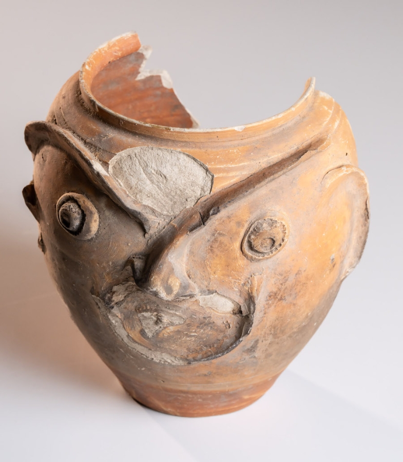 Ook nog bijna vrijwel intact en daarom bijzonder is een drinkbeker met een vrolijk gezicht erop. Het is gevonden in de buurt van een Romeins legerkamp. Deze vrolijke beker lag tientallen jaren in een afgesloten doos in een donkere loods maar krijgt straks ongetwijfeld een mooie plek in een museum.