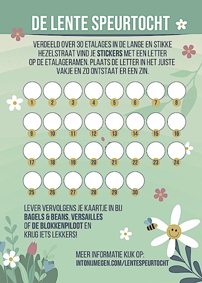 Lever vervolgens je kaartje in bij Bagels & Beans, Versailles of de Blokkenpiloot en krijg iets lekkers. intonijmegen.com/lentespeurtocht