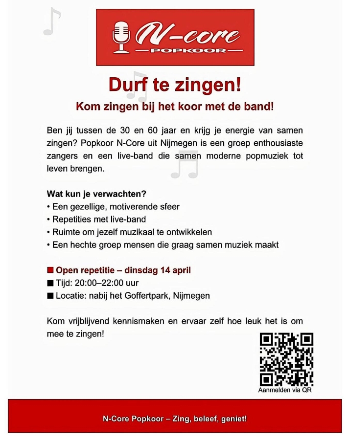 "We repeteren in de SSGN Nijmegen van 20.00 u tot 22.00 u. Je kunt je aanmelden via secretaris@n-core.nl. Het is geheel vrijblijvend dus pak deze kans! Dat vinden wij ook gezellig!"