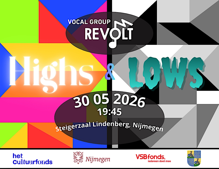 Vocal Group Revolt: "Dit jaar nemen we jullie graag mee op een muzikale reis langs de pieken en dalen van het leven, met momenten van twijfel en kwetsbaarheid tot momenten van kracht en hoop. We eindigen natuurlijk met een positieve noot (letterlijk en figuurlijk). Het optreden is op 30 mei om 19:45. Ga je mee? Tickets zijn te koop