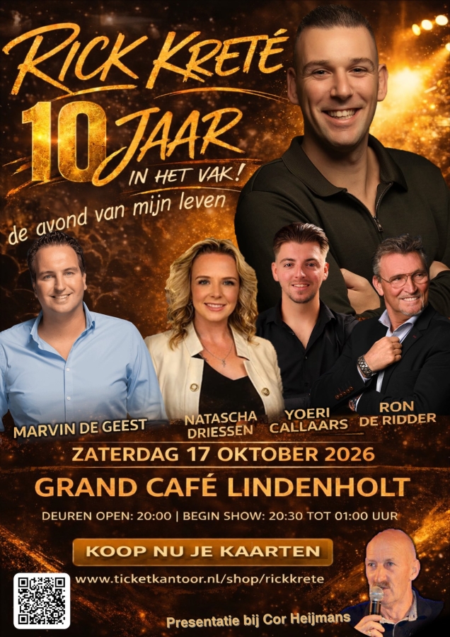 Rick Kreté: "Op 17 oktober vier ik mijn 10-jarig jubileum als zanger. Na tien jaar onafhankelijk aan de weg timmeren, met diverse singles op mijn naam, is het tijd voor een avond die mijn muzikale reis samenvat. Ik doe dit niet alleen: op 17 oktober pakken we groots uit in Grand Café Lindenholt!"