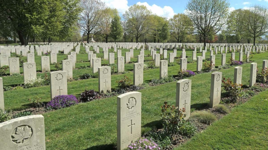 De ruim 2600 witte grafstenen op de Canadese Oorlogsbegraafplaats geven een indruk van de massaliteit van het oorlogsgeweld van WO2.