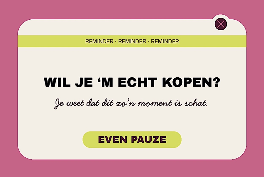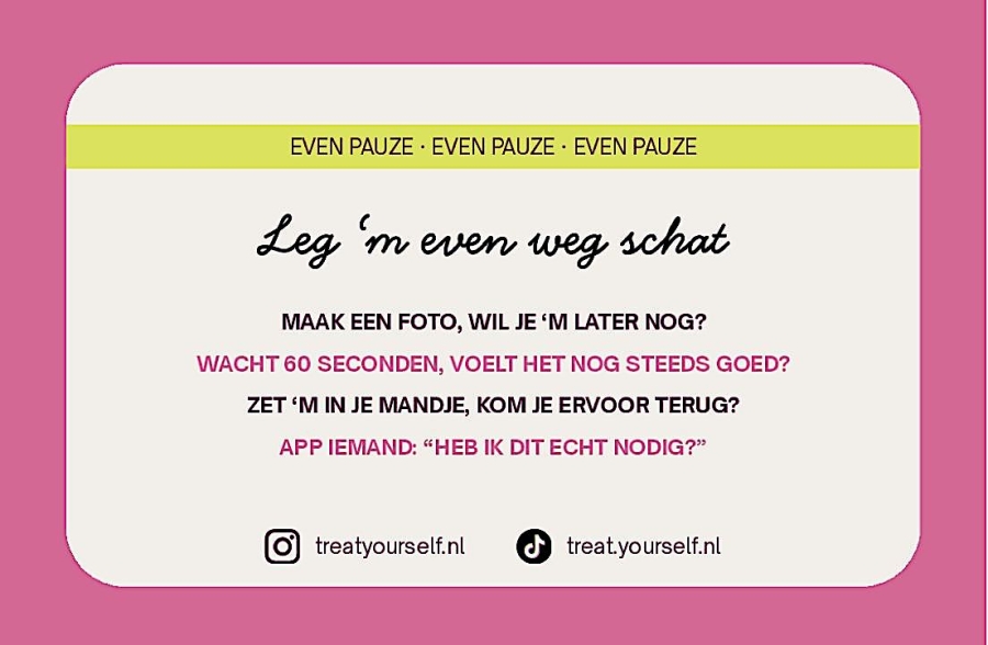 Het kaartje fungeert als een soort pauzeknop voor je portemonnee: een kleine reminder om even stil te staan voordat je iets koopt. Juist dat moment, waarin je normaal zonder nadenken afrekent, is waar het vaak misgaat.