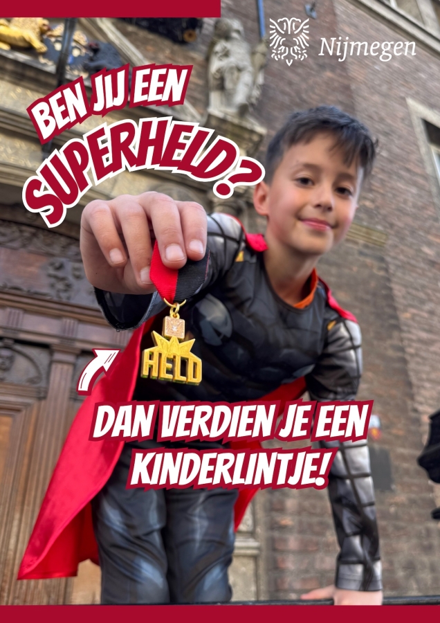 Superhelden zijn er in alle vormen en maten, maar de gemeente Nijmegen zoekt vooral de allerjongsten! Misschien heeft u wel een jonge superheld in uw omgeving? Iemand die bijvoorbeeld geld inzamelt voor het goede doel, de zieke buurvrouw helpt of ervoor zorgt dat de speelplek schoon en afvalvrij is. Heeft u al iemand in gedachten? En is deze superheld tussen de 4 en 13 jaar oud? Meld het kind dan aan voor een kinderlintje! Op nijmegen.nl/kinderlintjes vindt u meer informatie. Aanmelden kan tot 1 november 2026.