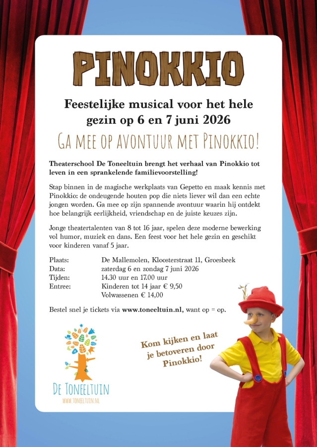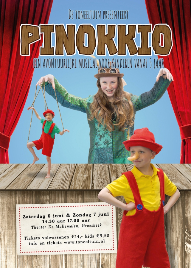 Op zaterdag 6 juni en zondag 7 juni verandert De Mallemolen in een magische werkplaats van de poppenmaker Gepetto. De productiegroep van Theaterschool De Toneeltuin brengt daar het wereldberoemde verhaal van Pinokkio op een sprankelende en eigentijdse manier tot leven.