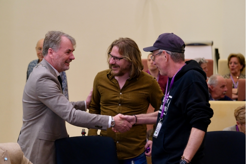 Wethouder Jean Paul Broeren nam als gastheer de rol van burgmeester Bruls over. 'De burgemeester is helaas verhinderd. Op vrijdag heeft hij zijn wekelijkse bingoavond. Ik sta hier als locoburgemeester compleet met ambtsketen en ik krijg er kiepevel van dat ik als Nimweegs jungske jullie hier welkom mag heten. Onze Nimweegse taol mag nooit verloren gaan.'