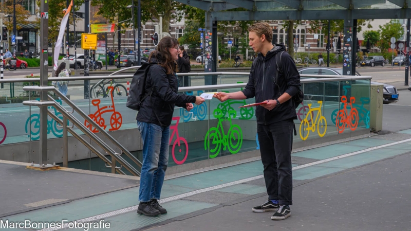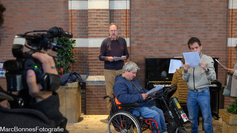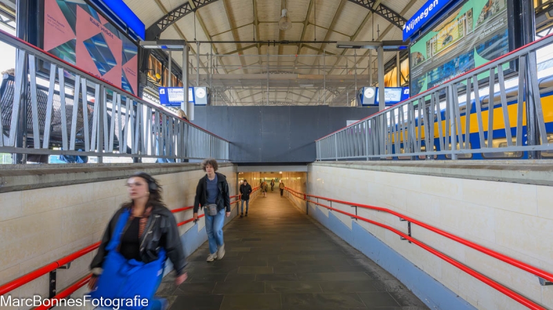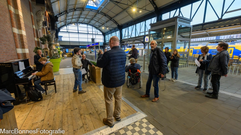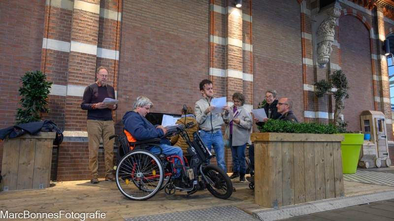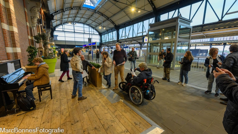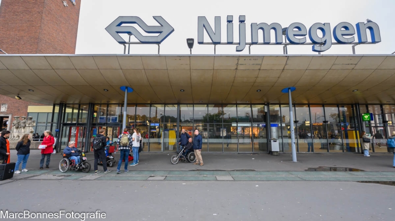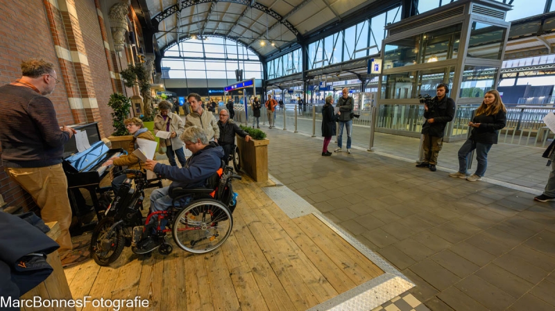 Dinsdag 7 oktober om 16.30 uur brachten medewerkers van het Zelfregiecentrum een muzikale ode aan de hellingbaan op station Nijmegen Centraal. Deze hellingbaan bij spoor 3/4 dreigt te verdwijnen en vervangen te worden door een lift en roltrap. Daardoor wordt de toegankelijkheid van het station voor mensen met een rolstoel, rollator of scootmobiel slechter. Wanneer de lift het niet doet, moeten zij naar een ander station reizen, om van daaruit alsnog op hun plaats van bestemming te komen. Dat is onaanvaardbaar. Ook ouders met kinderwagens, reizigers met zware koffers of een fiets hebben profijt van een hellingbaan. Deze slopen is je reinste geldverspilling.