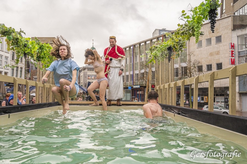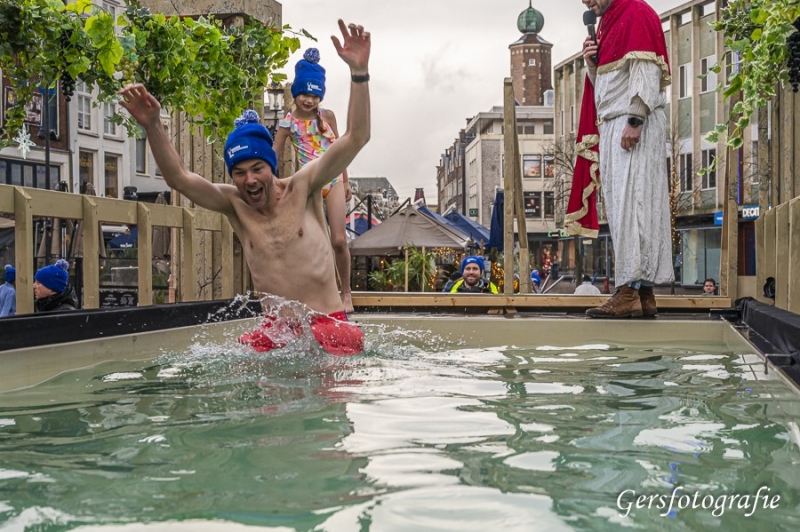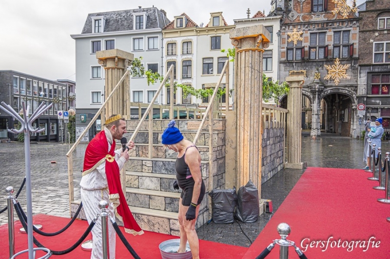 De eerste die in het Romeinse bad dook was een vrouw die daarvoor al in de Nevengeul was gedoken en met alle plezier ook Dé Nieuwjaarsduik 2024 op de Grote Markt rond 11.00 uur mee wilde maken! Eveneens ging de bekende Nijmeegse fotograaf Bart Kouwenberg er vol voor. Wat leuk!